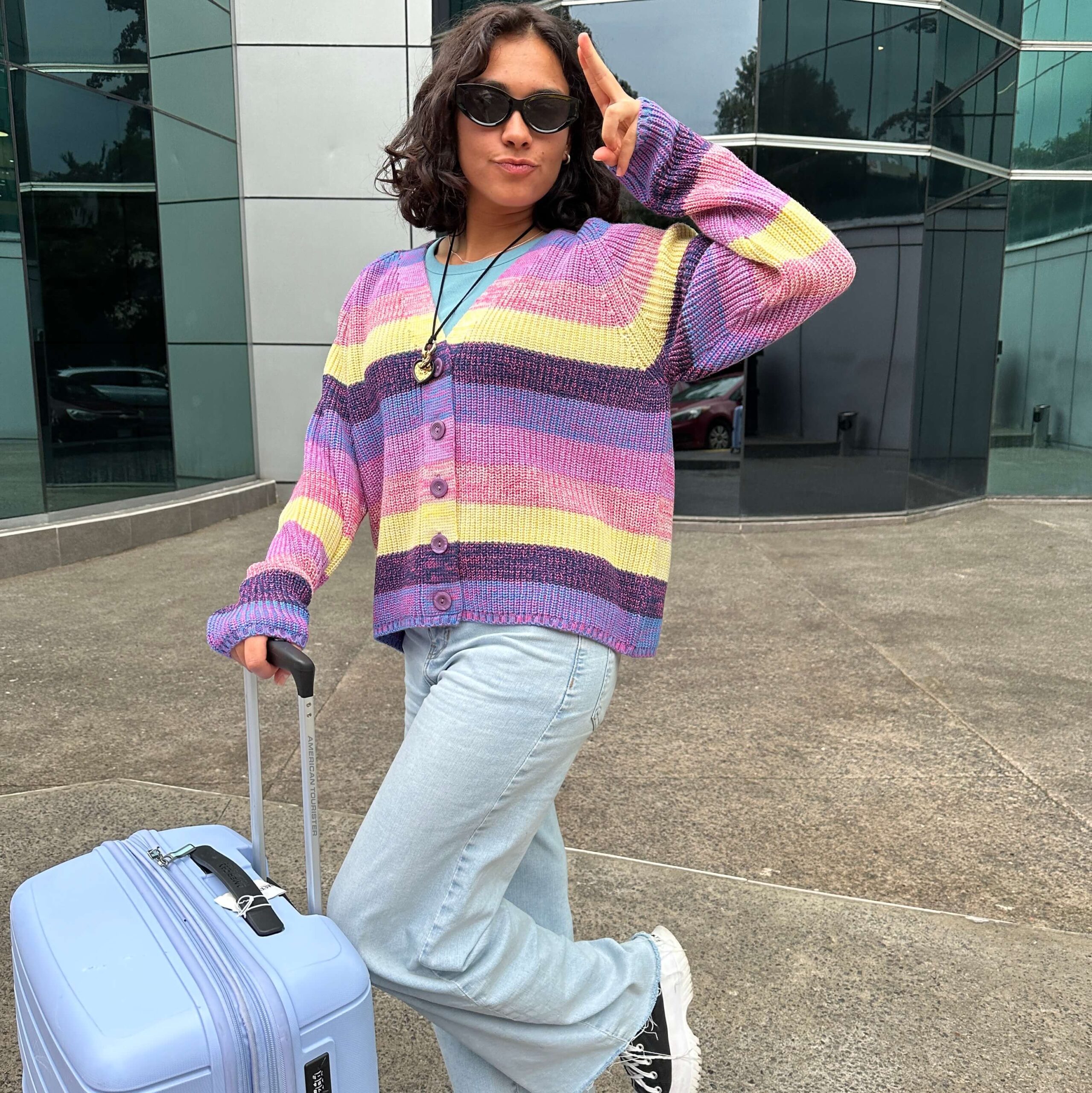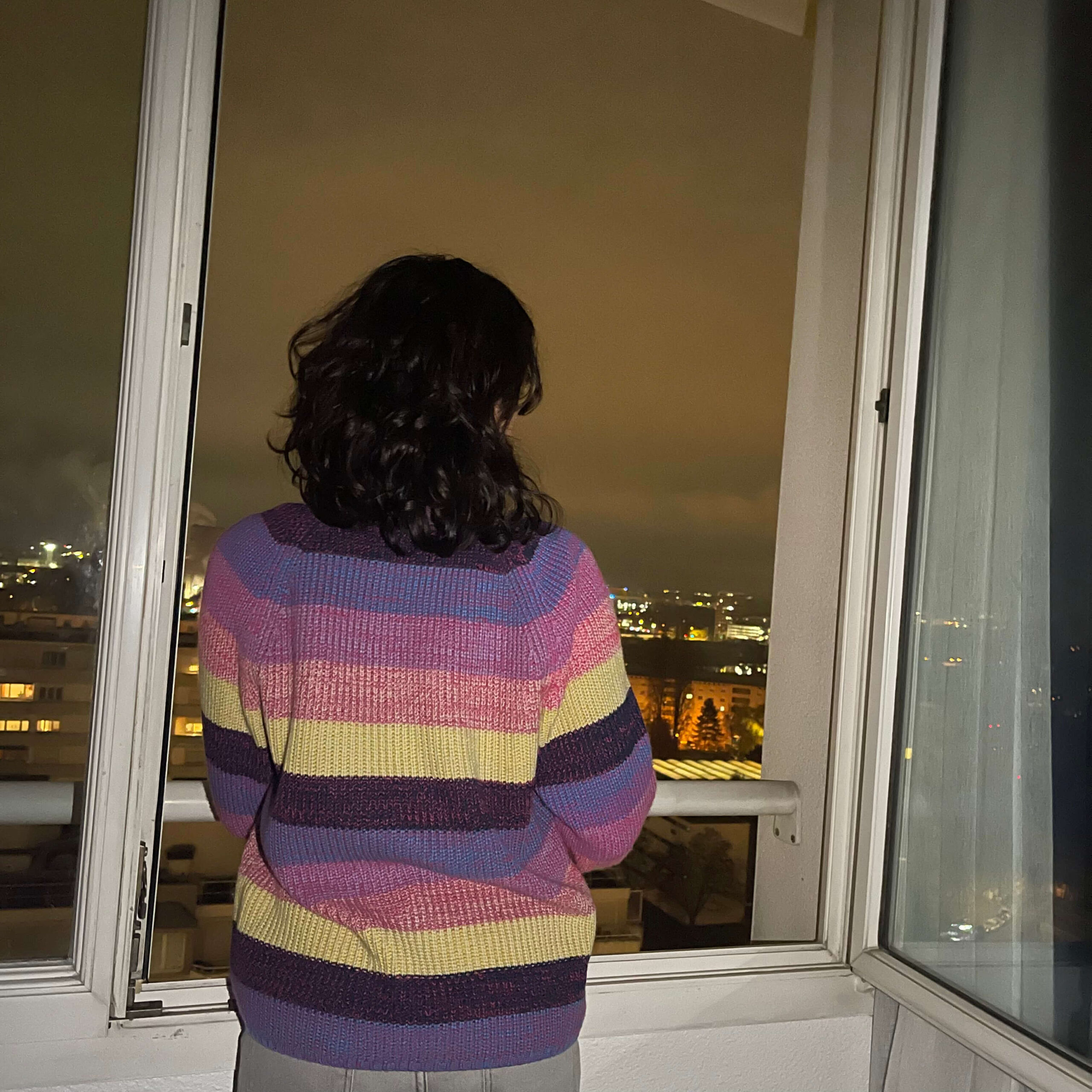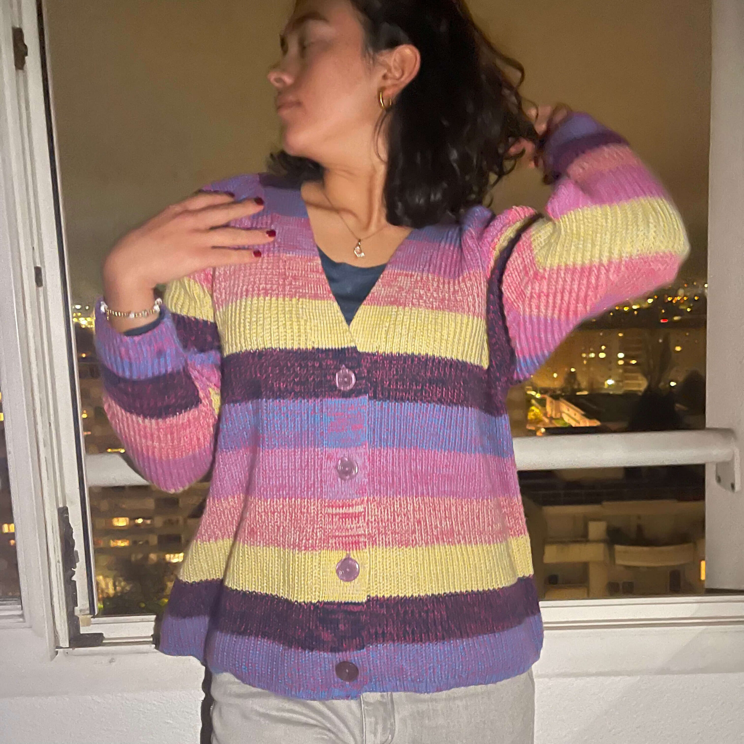 Este suéter oversized abierto con franjas de colores amarillo, morado, azul y lila jaspe es una prenda moderna, versátil y cómoda para la mujer. Confeccionado con un tejido de punto medio suave y ligero, es ideal para usar con jeans, faldas o shorts. En otoño, puedes combinarlo con una blusa de manga corta y short o jeans, y en invierno, con una blusa de manga larga y pantalones o vestidos más gruesos. Sus botones le dan un toque distintivo. Una excelente opción para regalar. Talla disponible: CH-M y M-G. Recomendamos lavar a mano, en lavadora ciclo delicado, secar extendido
